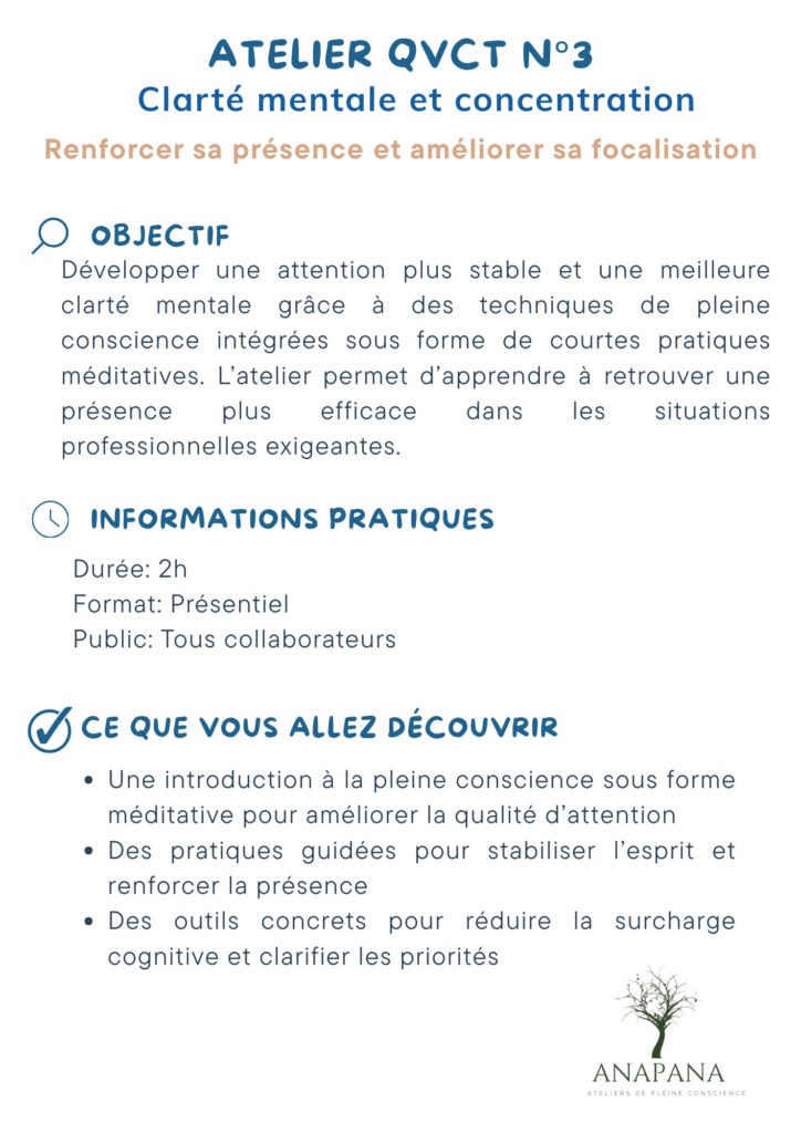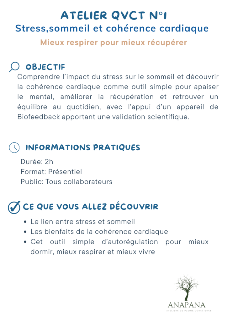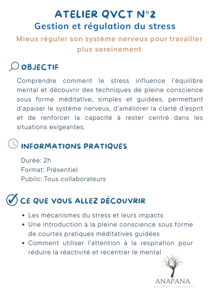 Ces ateliers QVCT proposent des interventions concrètes et directement applicables pour agir sur la gestion du stress, la régulation émotionnelle et le bien-être au travail.